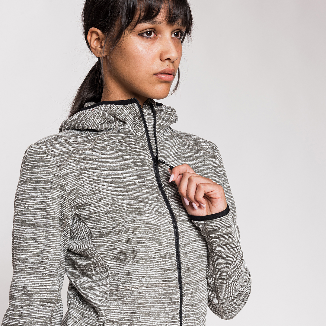 • Nastro in lycra sul foro del cappuccio, in vita e sul fondo manica