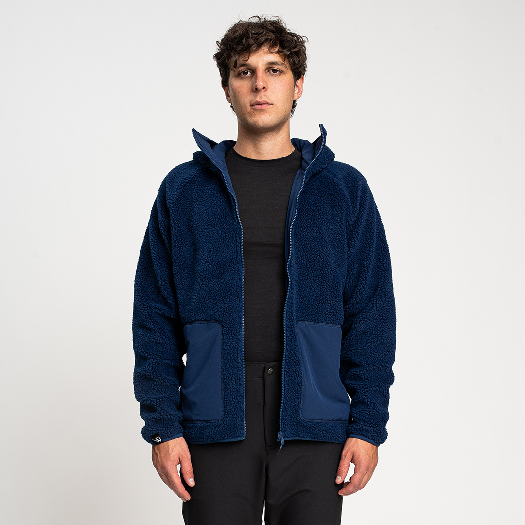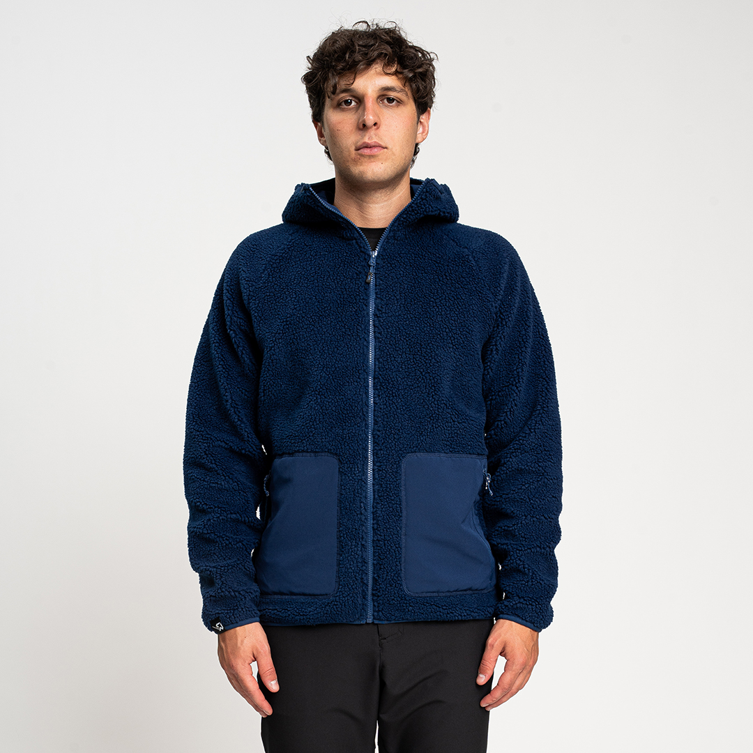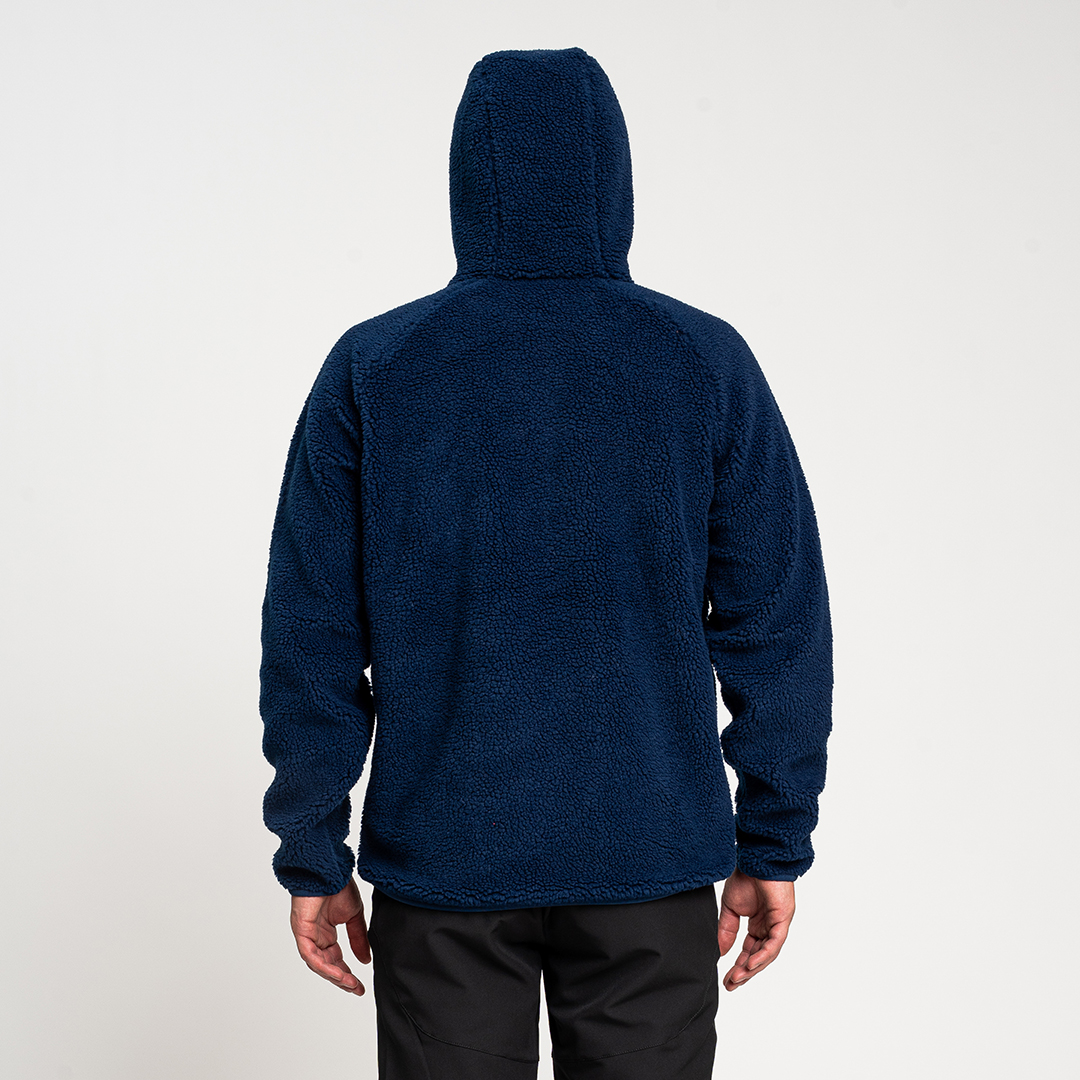 Re.Moose Pass è un pile sherpa riciclato dotato di nastro in lycra su cappuccio, fondo capo e fondo manica.