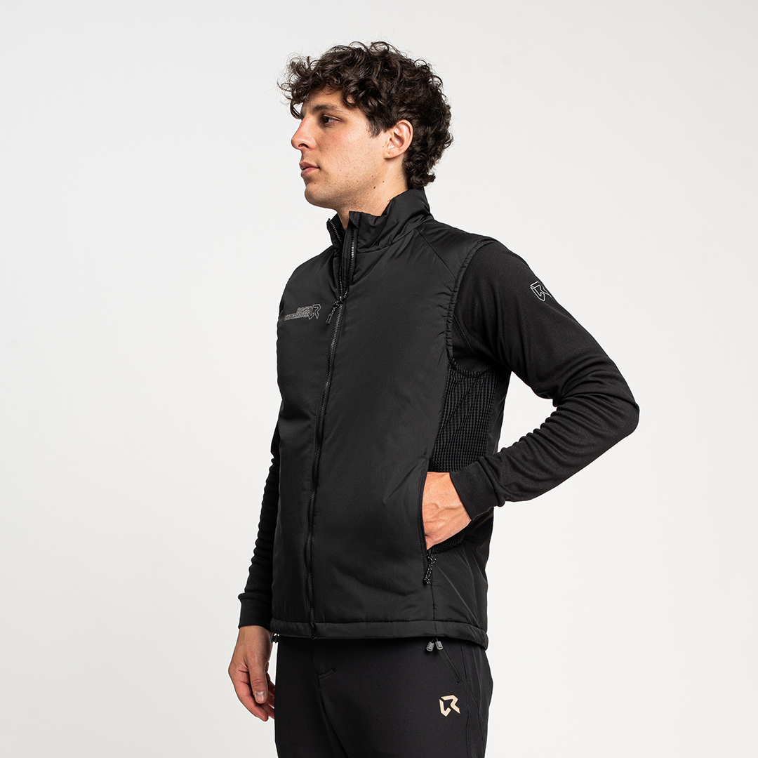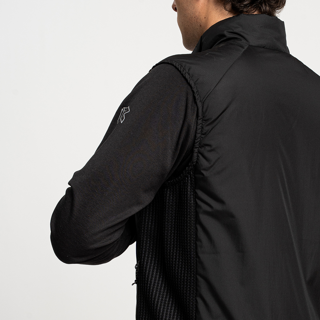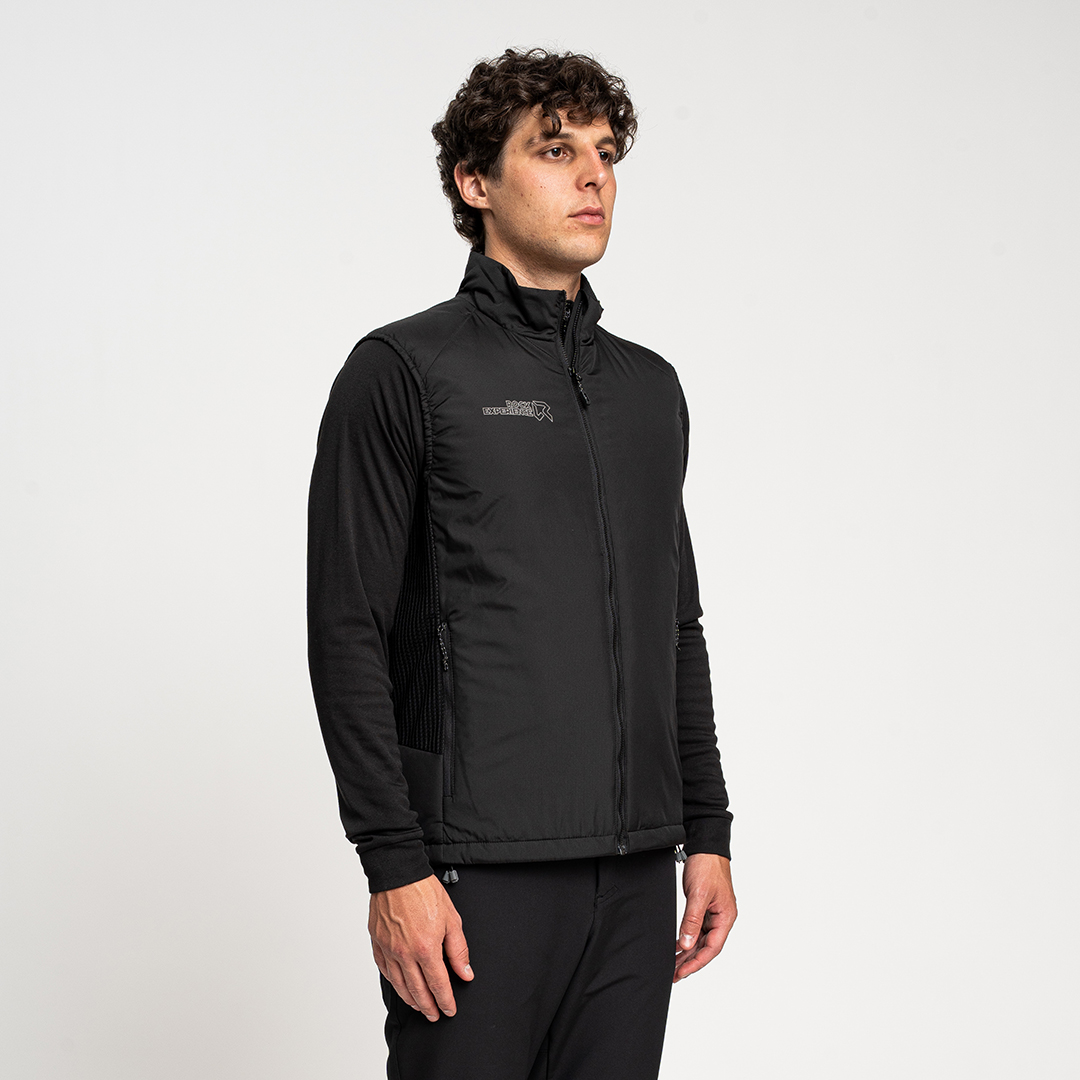 - Gilet ibrido con pannelli laterali realizzati in pile con motivo waffle per intrappolare il calore e allontanare l'umidità