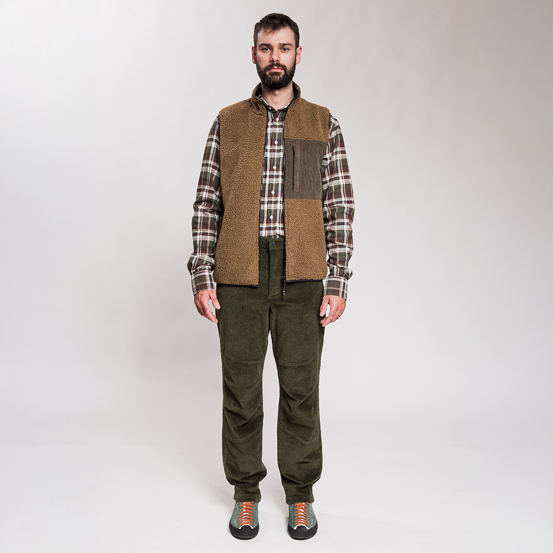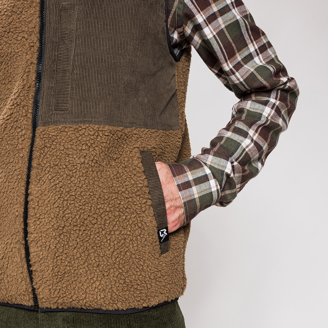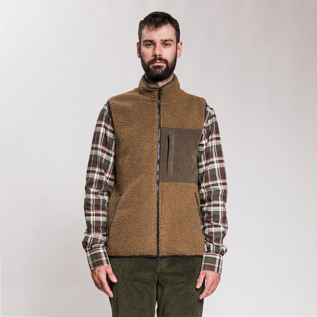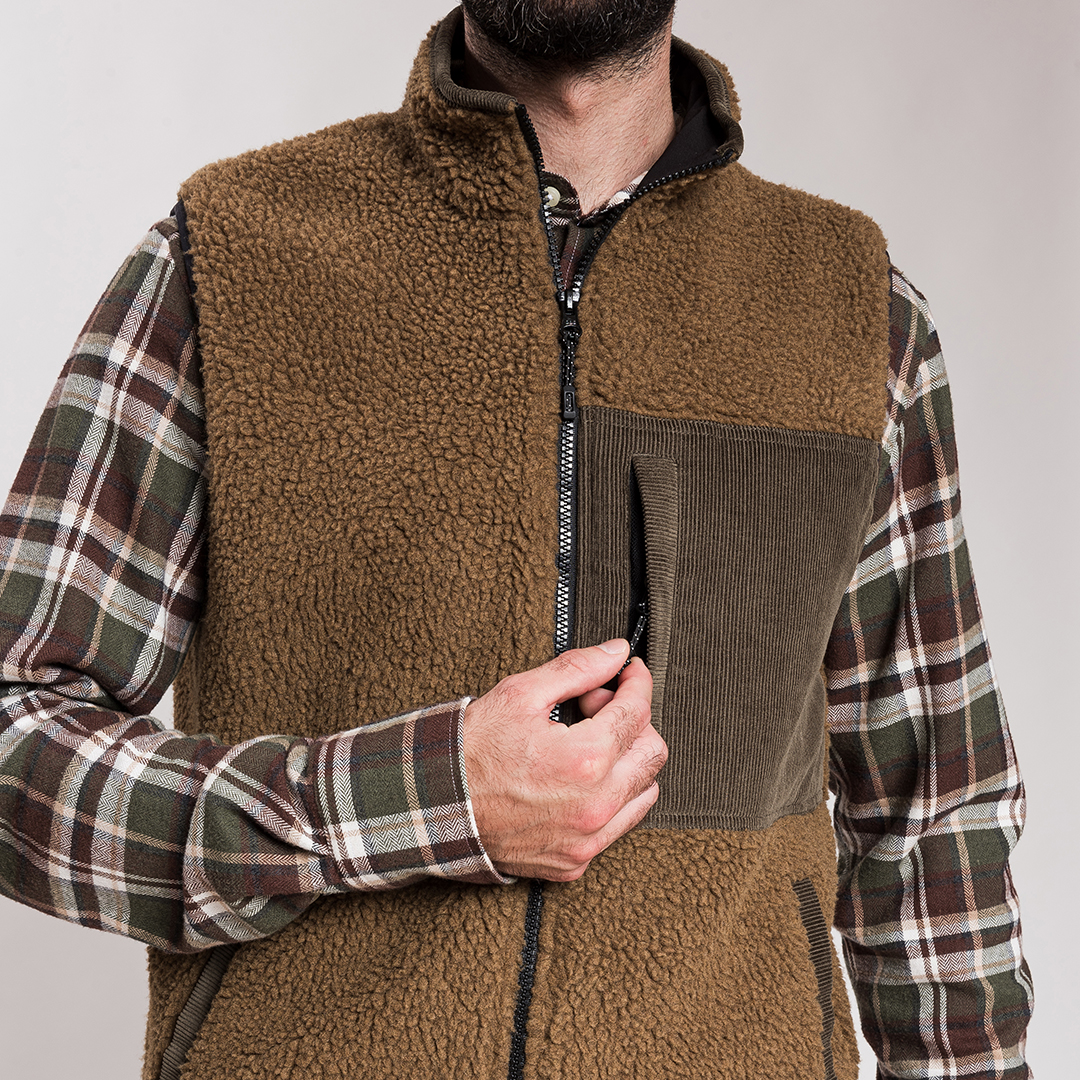 Gilet realizzato in pile sherpa 100% riciclato, ideale per chi cerca comfort, stile e attenzione all’ambiente.