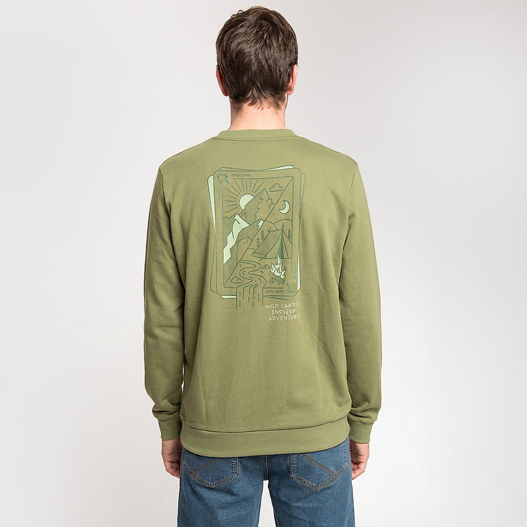 STARGATE è una felpa Regular Fit in French Terry di cotone organico, morbida e traspirante per l’uso quotidiano. Il girocollo e i bordi a costina assicurano vestibilità stabile, mentre la piccola stampa logo sul petto e la grande grafica “Wild cards” sul retro esprimono carattere street-outdoor. Perfetta per everyday wear, viaggio e post-attività.