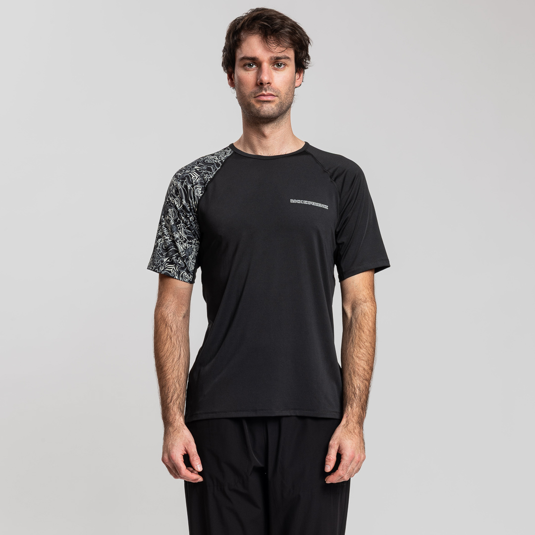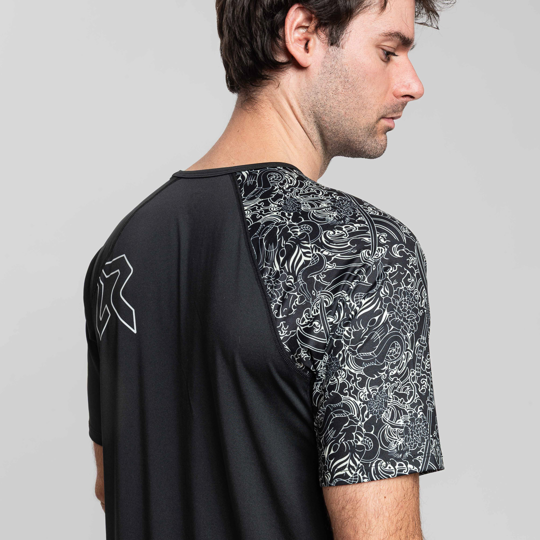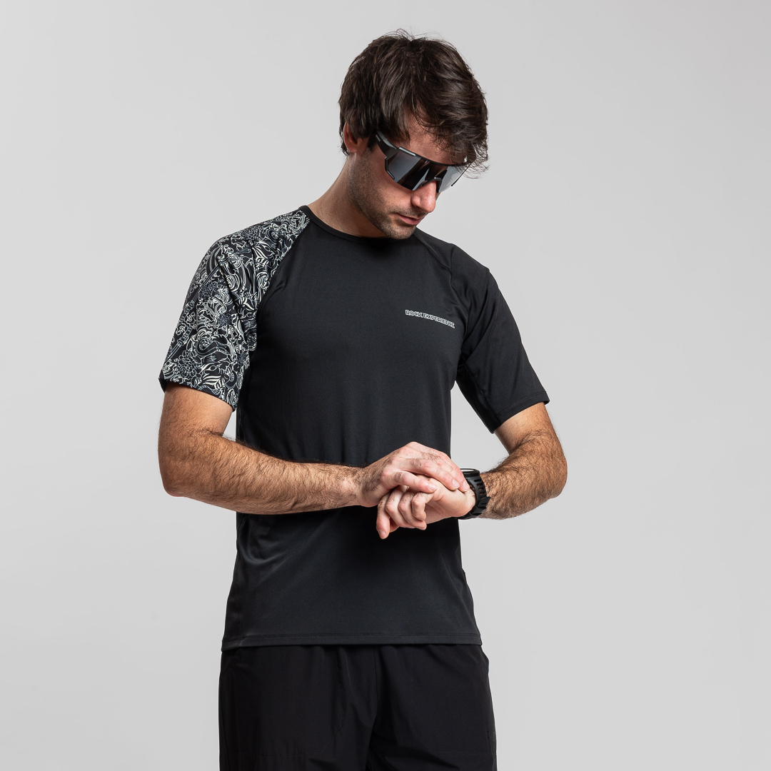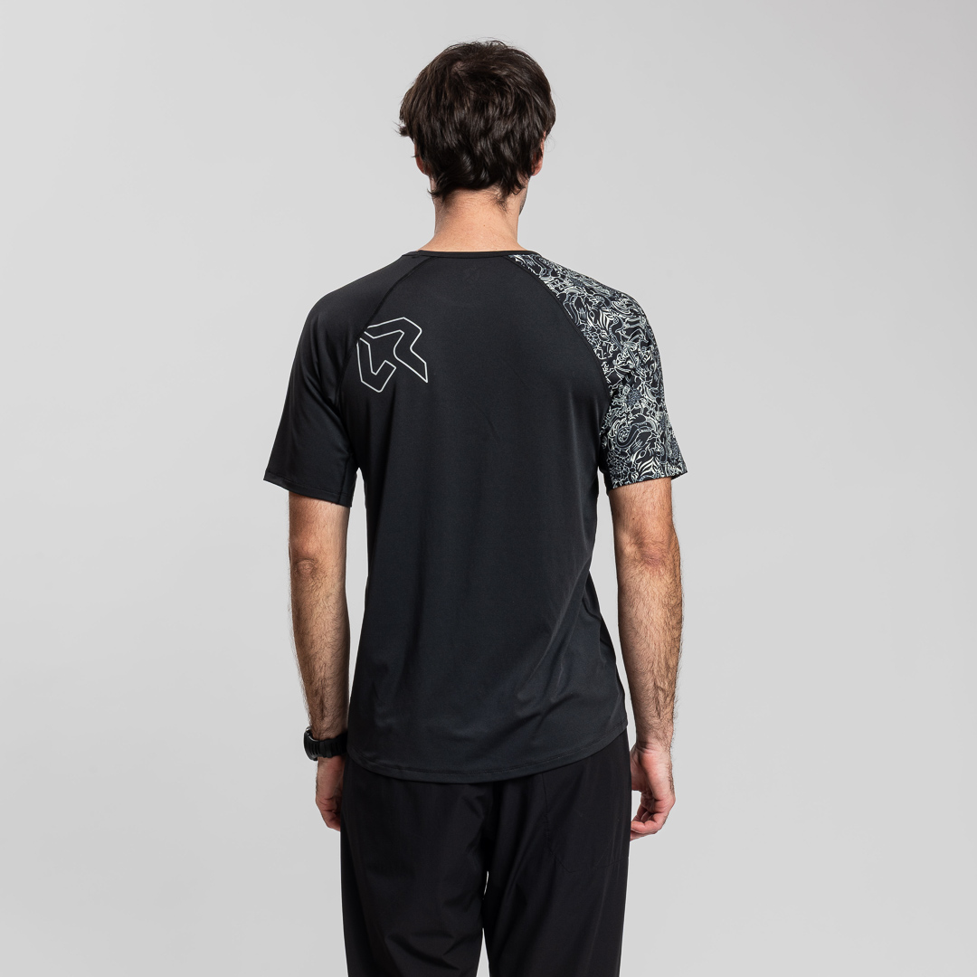 La maglietta da trail running "Yuudai" è caratterizzata da una vivace e dettagliata stampa a motivo tattoo che avvolge completamente la manica destra, conferendo uno stile distintivo. La cura nei dettagli emerge anche nelle cuciture piatte, mirate ad evitare spessori lungo le cuciture, garantendo un comfort ottimale durante l'attività sportiva. La presenza di loghi riflettenti aggiunge un tocco di sicurezza e stile, assicurando visibilità in condizioni di scarsa illuminazione. La "Yuudai" è la scelta ideale per chi cerca prestazioni elevate con un tocco di originalità.