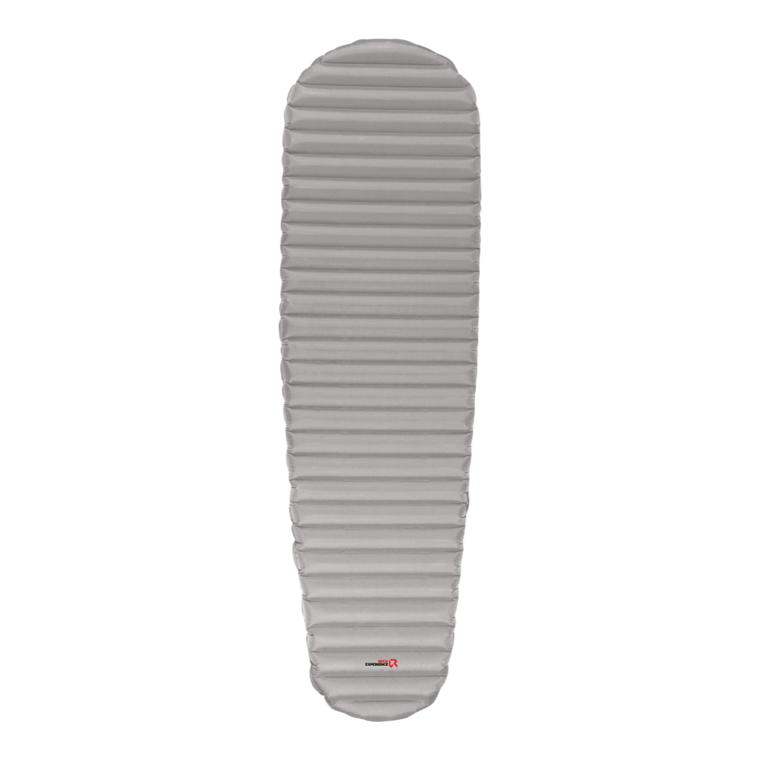 Materasso gonfiabile in nylon, dotato di valvola di gonfiaggio integrata nel sacco di compressione che funge anche da pompa, per un utilizzo facile e rapido.