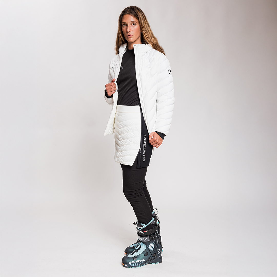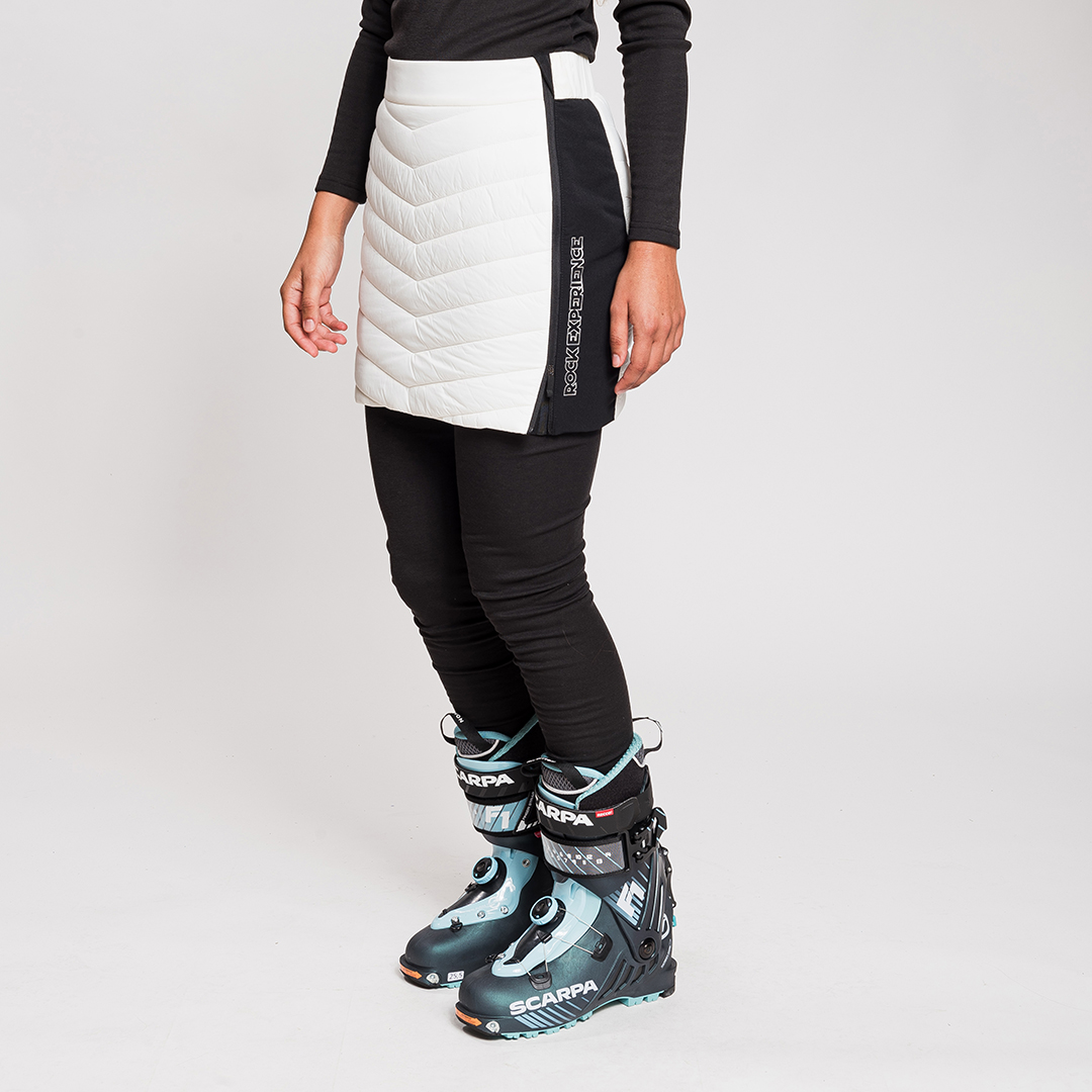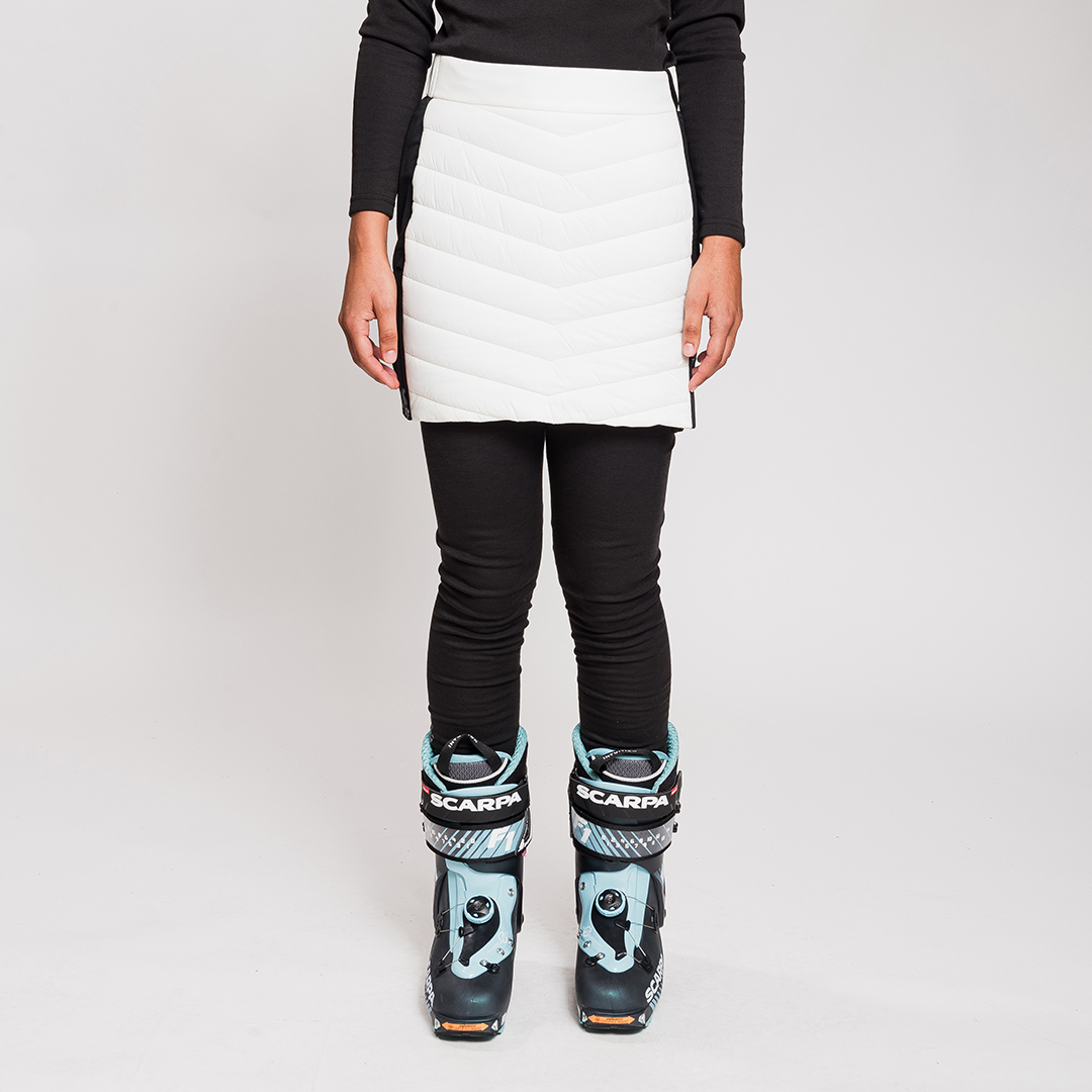 Impatience è una gonna imbottita dedicata allo scialpinismo. È uno strato termico aggiuntivo contro freddo, vento e neve. Da indossare nelle giornate più fredde sopra i pantaloni in discesa o sopra la tutina nel pre-gara, Impatience garantisce calore aggiuntivo senza rinunciare a un estremo comfort. Facile e veloce da indossare senza togliere gli scarponi, grazie alle zip laterali. La realizzazione della Impatience con diversi tessuti soddisfa le diverse esigenze per cui è stata progettata. L’imbottitura in poliestere riciclato sul davanti e sul retro offre un calore leggero e traspirante mentre il tessuto esterno in nylon ripstop DWR è particolarmente resistente allo strappo e idrorepellente per far scivolare via le gocce di bagnato. Comfort e libertà di movimento sono invece assicurati dal tessuto stretch sui fianchi che rende la Impatience particolarmente elastica e confortevole.