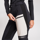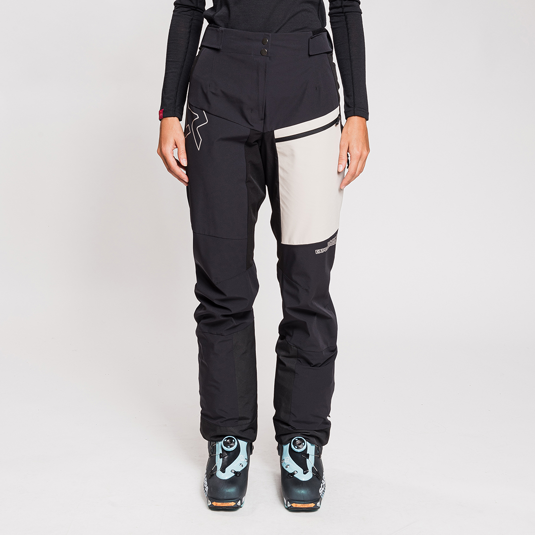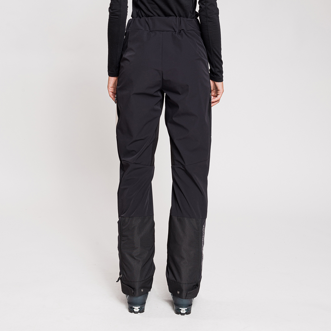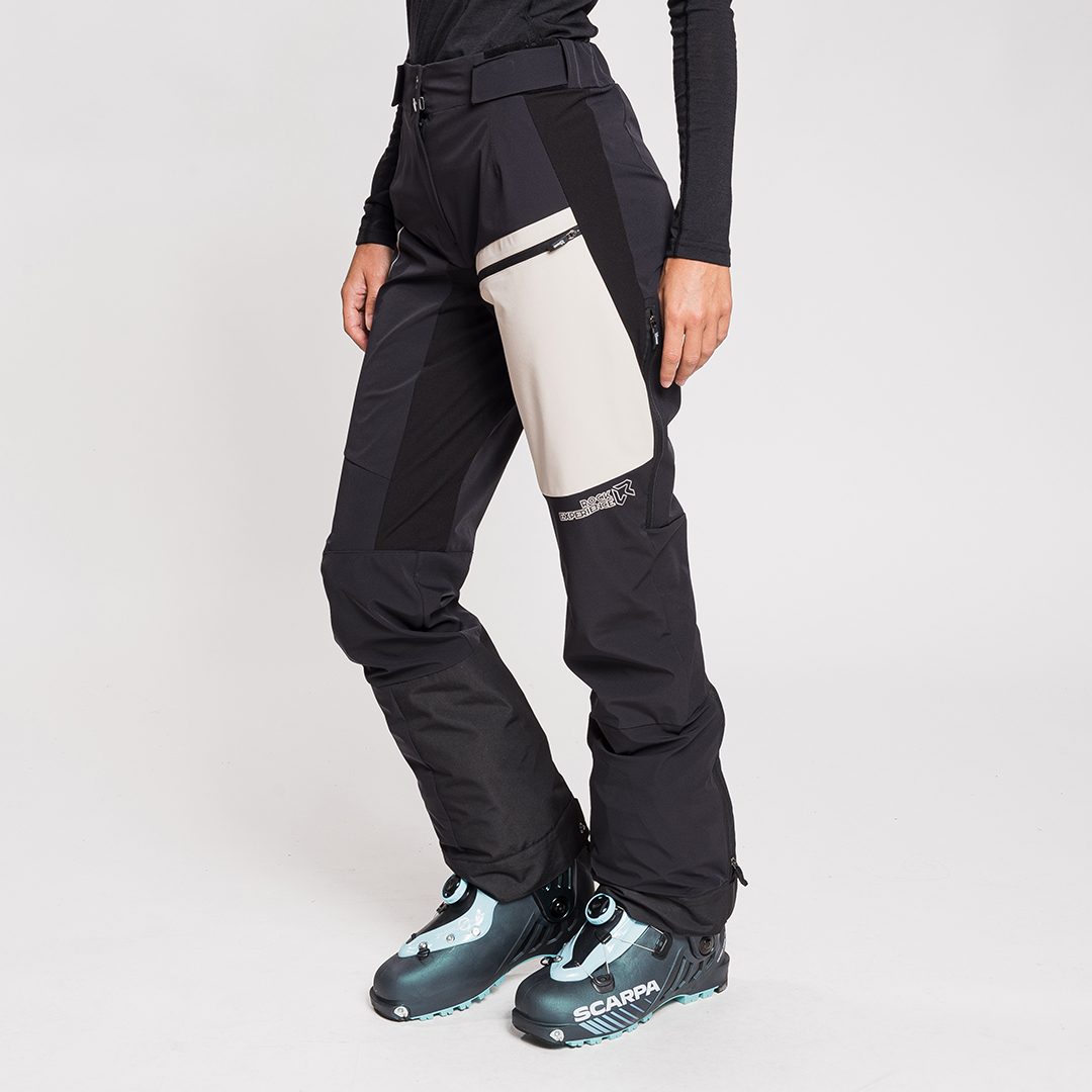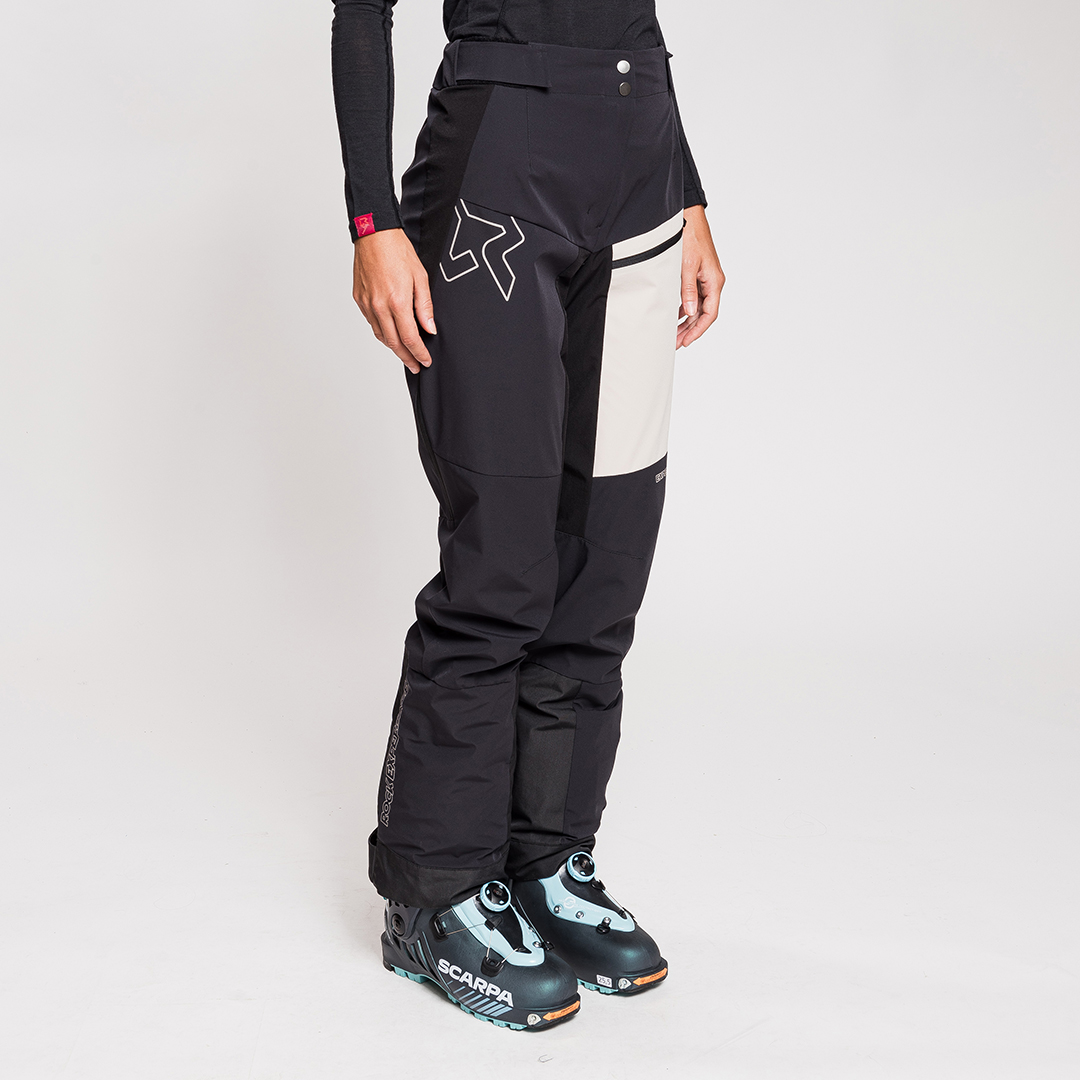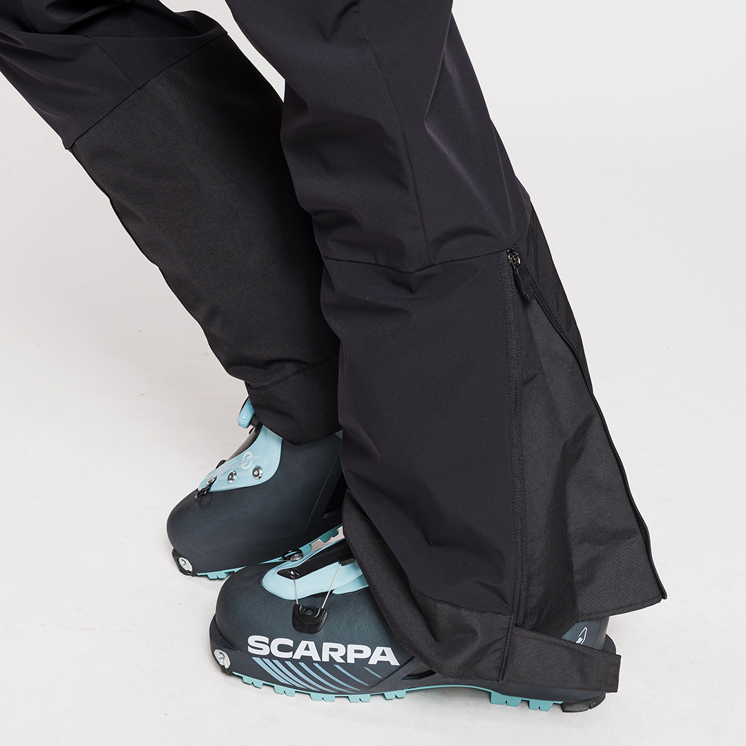 La parte inferiore delle gambe è rinforzata con tessuto resistente all’usura. Le ghette integrate, ridotte, hanno elastico interno per aderire perfettamente, mentre la patta inferiore ha due bottoni a pressione per adattarsi allo scarpone. Compatibili con bretelle.
