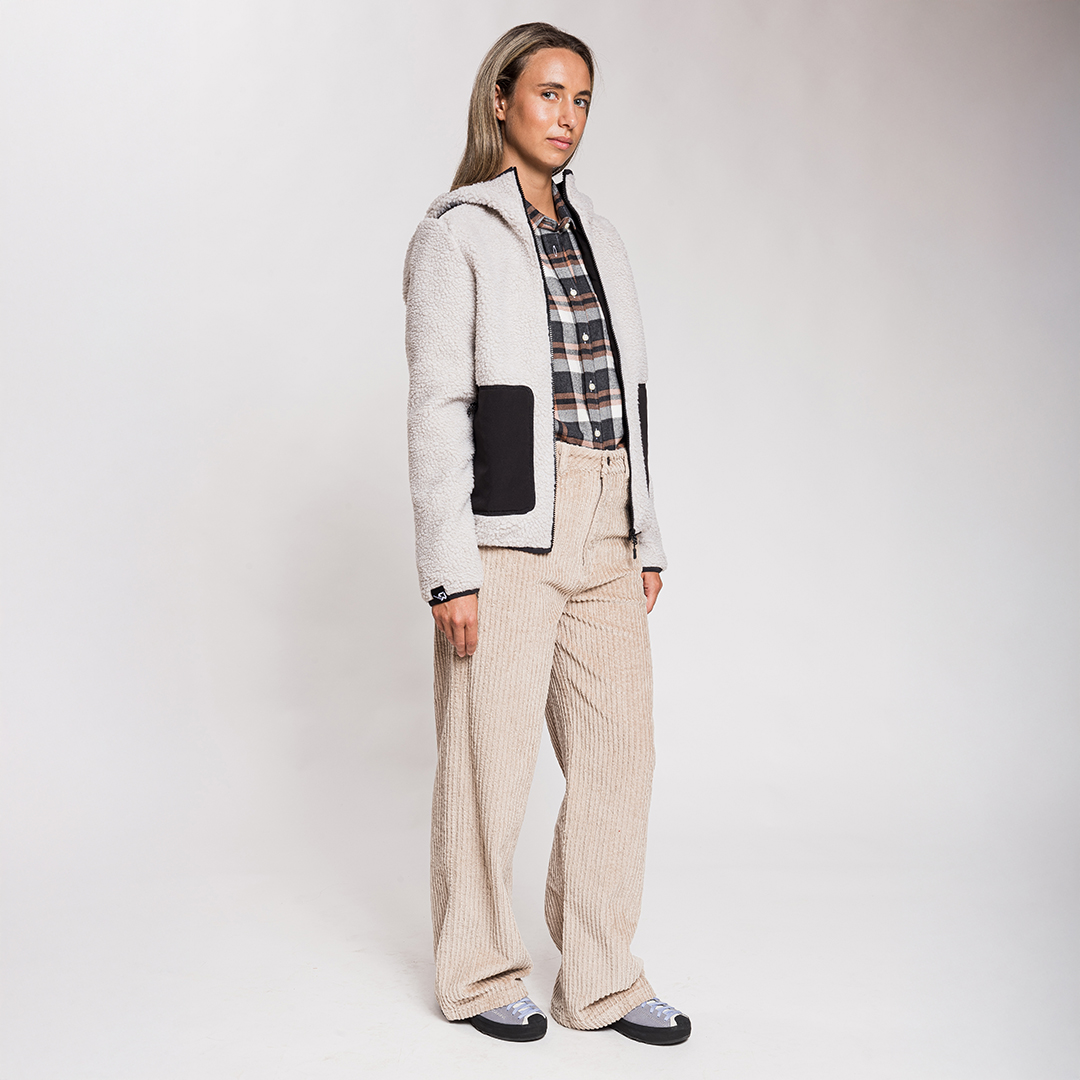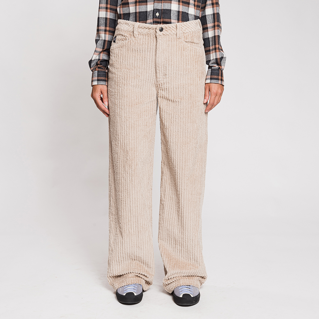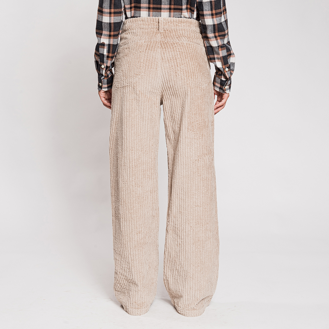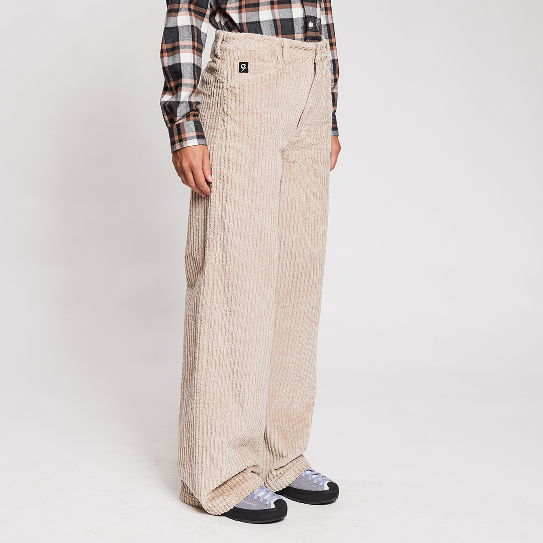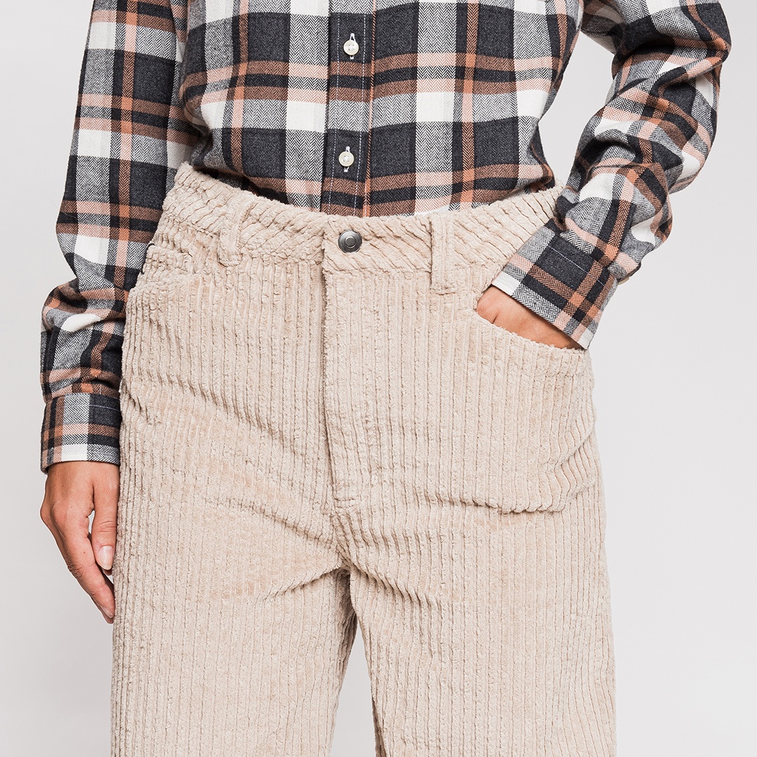 El Chalten è un morbido pantalone in velluto a coste stretch a righe larghe, con chiusura in vita tramite bottone e zip in metallo e dotato di cinque comode tasche.